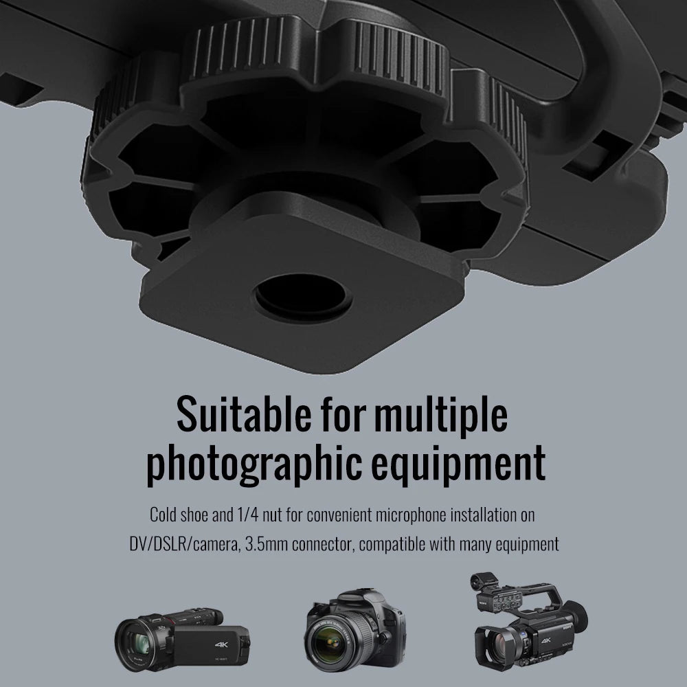 This microphone is specifically designed for DSLR cameras and comes with a standard cold shoe mount for easy installation. It has an anti-vibration structure that effectively reduces mechanical noise and vibration noise, resulting in clean and high-quality audio. The microphone is powered by a single 1.5V AA battery (not included) and has a lightweight design, weighing only 75g.
