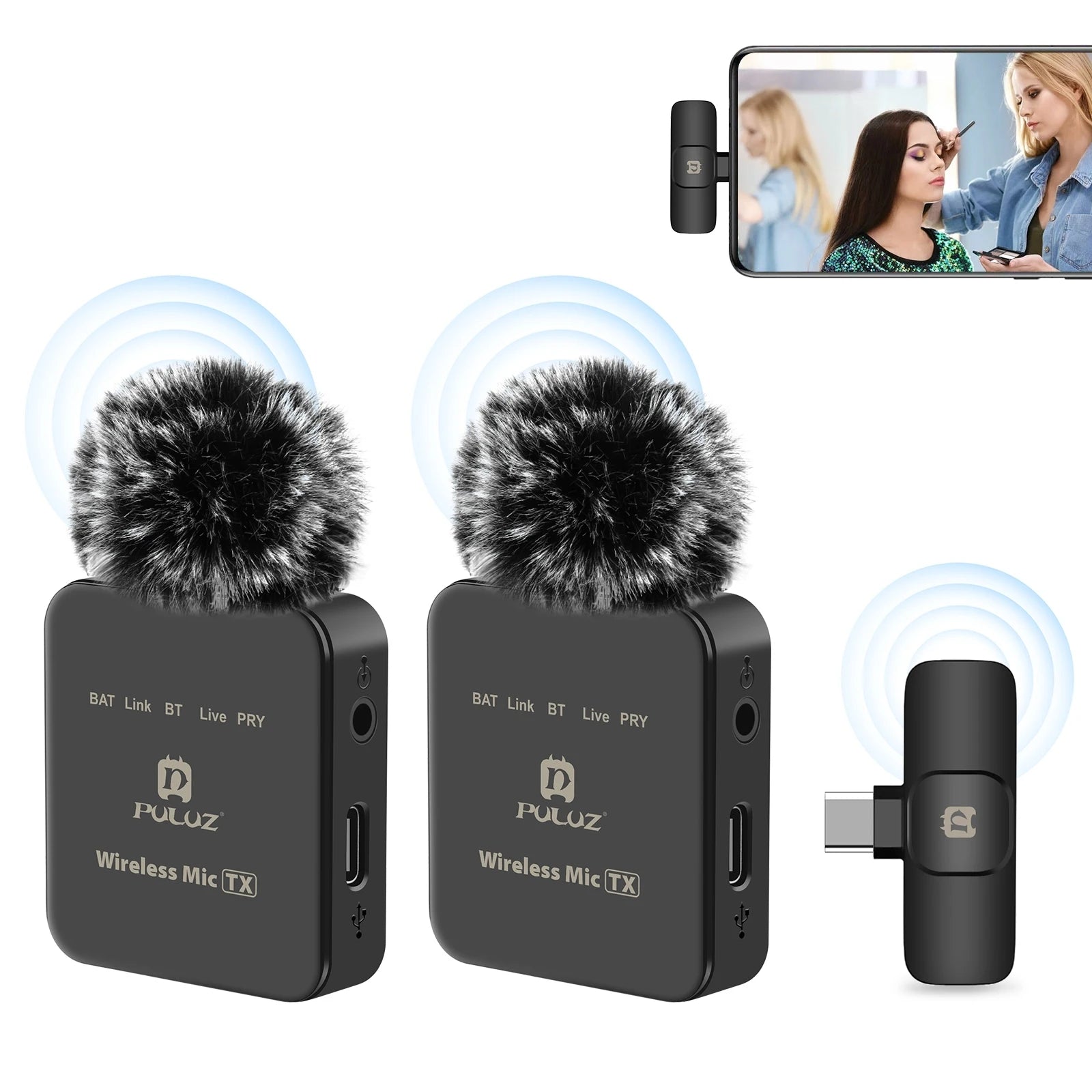 The Ultimate Wireless Microphone System for Seamless Live Streaming and Vlogging is the perfect accessory for interviews, smartphones, computers, and cameras. With a 10M transmission range, this wireless microphone system provides high-quality recording and eliminates the hassle of tangled cables. This wireless microphone system features a 2.4G wireless connection, ensuring a seamless and stable connection for up to 48K high-fidelity recording. The microphone has a low latency with a signal-to-noise ratio greater than 65dbo, resulting in no sense of delay during recording. Additionally, the system is equipped with ENC (Excellent Noise Cancellation) technology, allowing you to record in noisy environments without any interference. The microphone system also has a BT mode, which enables you to use the lavalier microphone for karaoke or add background sound during recording. The dodging function automatically suppresses background BT music when recording, ensuring clear and professional audio. Moreover, the reverb function adds a touch of infectious sound to your recordings. With a 300mAh high-capacity battery, this wireless microphone system provides up to 12 hours of continuous recording. It is easy to charge with the included charging cable. The system also comes with two transmitters, one receiver, two wind muffs, and a 3.5mm TRS audio cable, making it a complete package for all your recording needs. Features: - 2.4G wireless connection for seamless recording - High-fidelity recording with up to 48K audio quality - Low latency with no sense of delay - Excellent noise reduction performance for recording in noisy environments - BT mode for karaoke and adding background sound during recording Specifications: - Product Type: Lavalier Wireless Microphone - Channel system: One Microphone one Receiver - Control method: Button - Active and passive: Active - 2.4G solution: Jerry AD6976M4 - Working system: GFSK - Working frequency: 2.4G-2.4835GHZ - Radio sensitivity: -38db - Effective distance: Greater than or equal to 10 meters - Transmitter shutdown power consumption: 2ua - Transmitter power consumption (video mode): 25ma - Transmitter power consumption (BLE mode): 30-40ma - Receiver power consumption: 16ma - Receiver charging current for mobile phone: 1000ma - Microphone signal-to-noise ratio: Greater than or equal to 65db - Frequency response: 20Hz-20KHz - Monitoring: One-way monitoring - Microphone: Electret - Battery(TX): 300mAh - Talk time: More than 10 hours - Standby time (off state): 6 months - Charging input standard: DC-5V/MAX 200+/-10mA - Charging time: 1.5-2 hours Packing List: - 2 * Transmitters - 1 * Receiver - 2 * Wind Muffs - 1 * 3.5mm TRS Audio Cable
